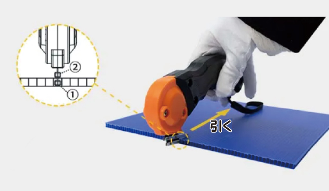 金属ガイド棒②をプラダンの中空部分に差し込み、後方に引いて切断します。